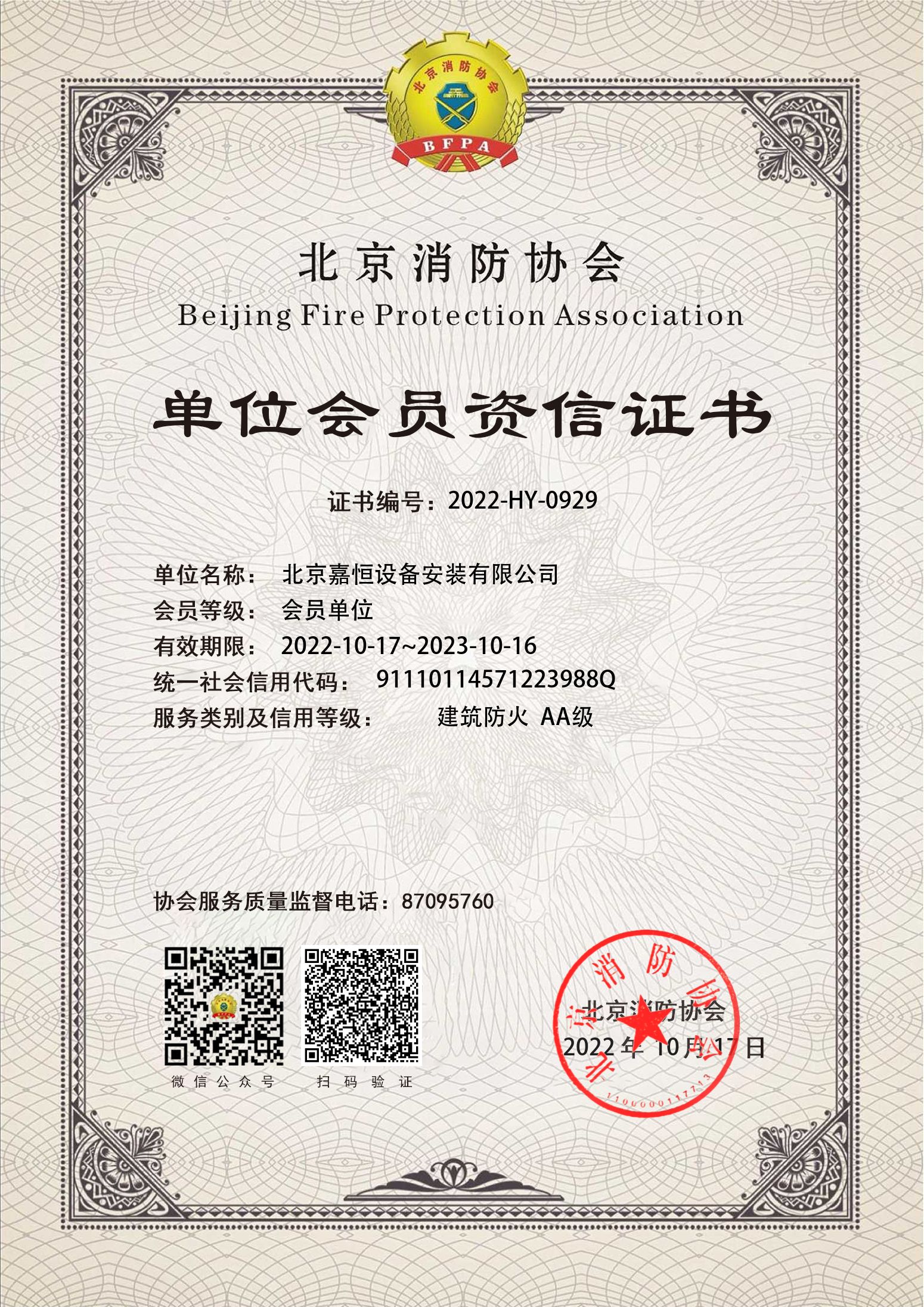 北京消防協(xié)會(huì)單位會(huì)員資信證書