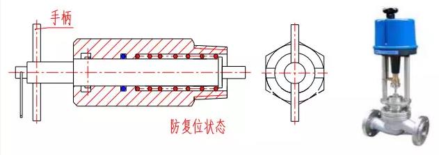 (6)確定積水排盡、系統(tǒng)無壓力后,拉體外防復(fù)位機(jī)構(gòu)手柄使閥瓣復(fù)位,然后將其旋至防復(fù)位狀態(tài)。