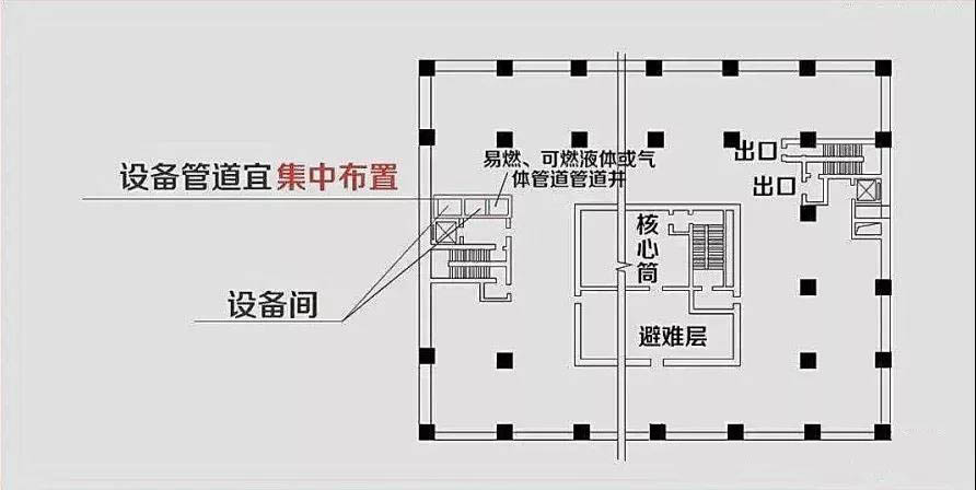 設(shè)備管理宜集中布置,其中的易燃、可燃液體或氣體管道應(yīng)集中布置,設(shè)備管道區(qū)應(yīng)采用耐火極限不低于3.00h的防火隔墻與避難區(qū)分隔。管道井和設(shè)備間應(yīng)采用耐火極限不低于2.00h的防火隔墻與避難區(qū)分隔,管道井和設(shè)備間的門不應(yīng)直接開(kāi)向避難區(qū);確需直接開(kāi)向避難區(qū)時(shí),與避難層區(qū)出入口的距離不應(yīng)小于5m,且應(yīng)采用甲級(jí)防火門。