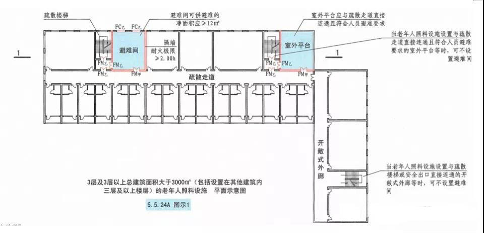 當(dāng)老年人照料設(shè)施設(shè)置與疏散樓梯或安全出口直接連通的開(kāi)敞式外廊、與疏散走道直接連通且符合人員避難要求的室外平臺(tái)時(shí),可不設(shè)置避難間。