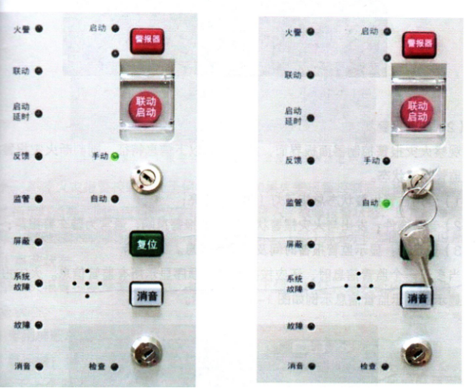 2、觀察火災(zāi)報(bào)警控制器面板界面的基本按鍵與指示燈單元內(nèi)手動(dòng)和自動(dòng)控制狀態(tài)的指示燈點(diǎn)亮情況,判斷控制器處于何種控制狀態(tài)。