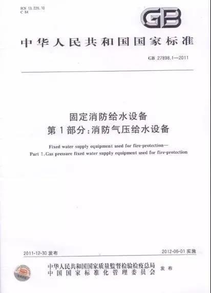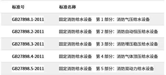 在2011年12月30日,國(guó)家又頒布了《GB27898:固定消防給水設(shè)備》;該標(biāo)準(zhǔn)作為GA30.2的升級(jí)標(biāo)準(zhǔn),一共分為5個(gè)部分,(見(jiàn)下表):