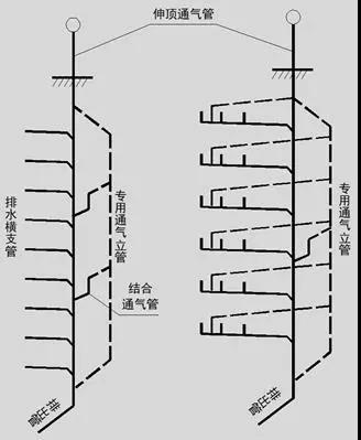 當建筑物層數(shù)和衛(wèi)生器具較多時,因排水量大,空氣流動過程宜受排水過程干擾,須將排水管和通氣管分開,設專用通氣管道。