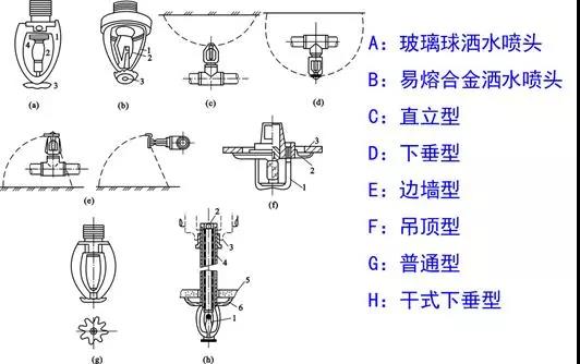 其構造按濺水盤的形式和安裝位置有直立型、下垂型、邊墻型、普通型、吊頂型和干式下垂型灑水噴頭之分。