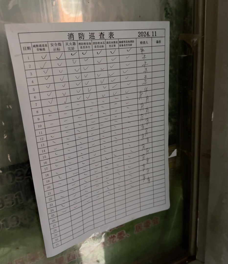 既然真實存在疏散通道被堵占的問題,為何張貼在單元門口的消防巡查表卻在“疏散通道是否暢通”一欄全打了對鉤?上述物業(yè)公司負(fù)責(zé)人支支吾吾,無法作出合理解釋。左志軍認(rèn)為該物業(yè)公司未如實記錄防火檢查情況,“我們已責(zé)令其限期改正,如果逾期未改正,我們將依法處罰。”
