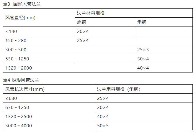 (6)風(fēng)管法蘭材料應(yīng)符合表3、表4的規(guī)定,法蘭螺栓及鉚釘?shù)拈g距應(yīng)小于或等于150mm。