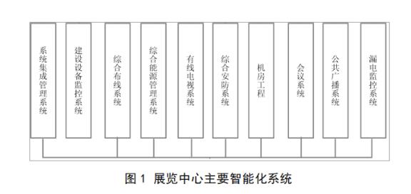 該工程為廣州市某中心項(xiàng)目,屬于大型公共建筑,工程總建筑面積為8.4㎡,地下3層,地上9層。該工程以規(guī)劃展覽為主,輔有城建檔案、地方志展館等功能,是目前國(guó)內(nèi)規(guī)模最大、功能設(shè)施最完善、融合了動(dòng)感4D、聲、光、電等高科技術(shù)的規(guī)劃展館。其弱電工程種類(lèi)及范圍非常廣泛,比如設(shè)備監(jiān)控、能源管理、綜合安防、綜合布線等系統(tǒng),共計(jì)20個(gè)子項(xiàng)目,如圖1所示。